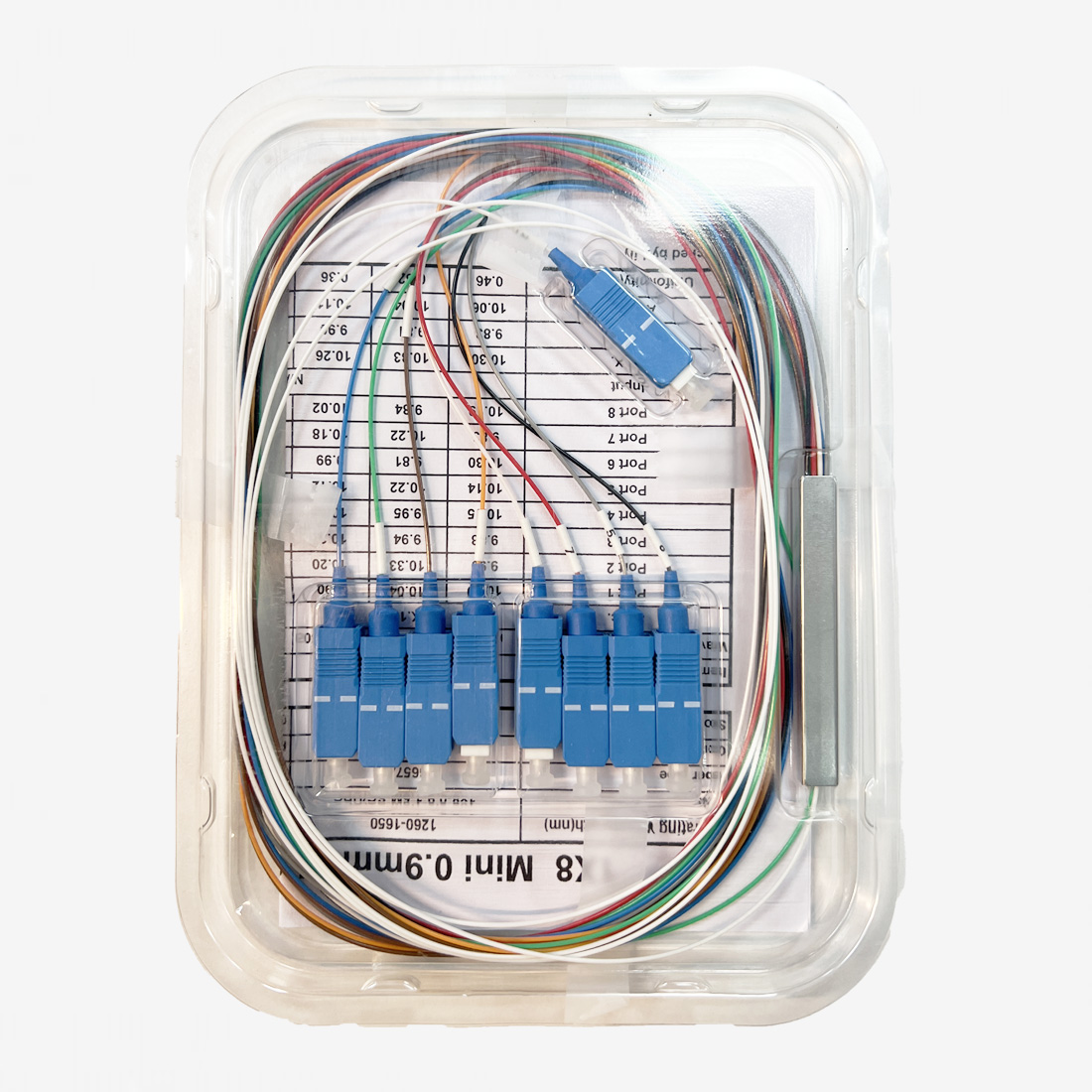 Etiketler 1x8 bölücü, 1x8 SC UPC, fiber optic splitter, FO-PLC-M-A1X8A, optical network, SC UPC Splitter 1x8, splitter 1x8